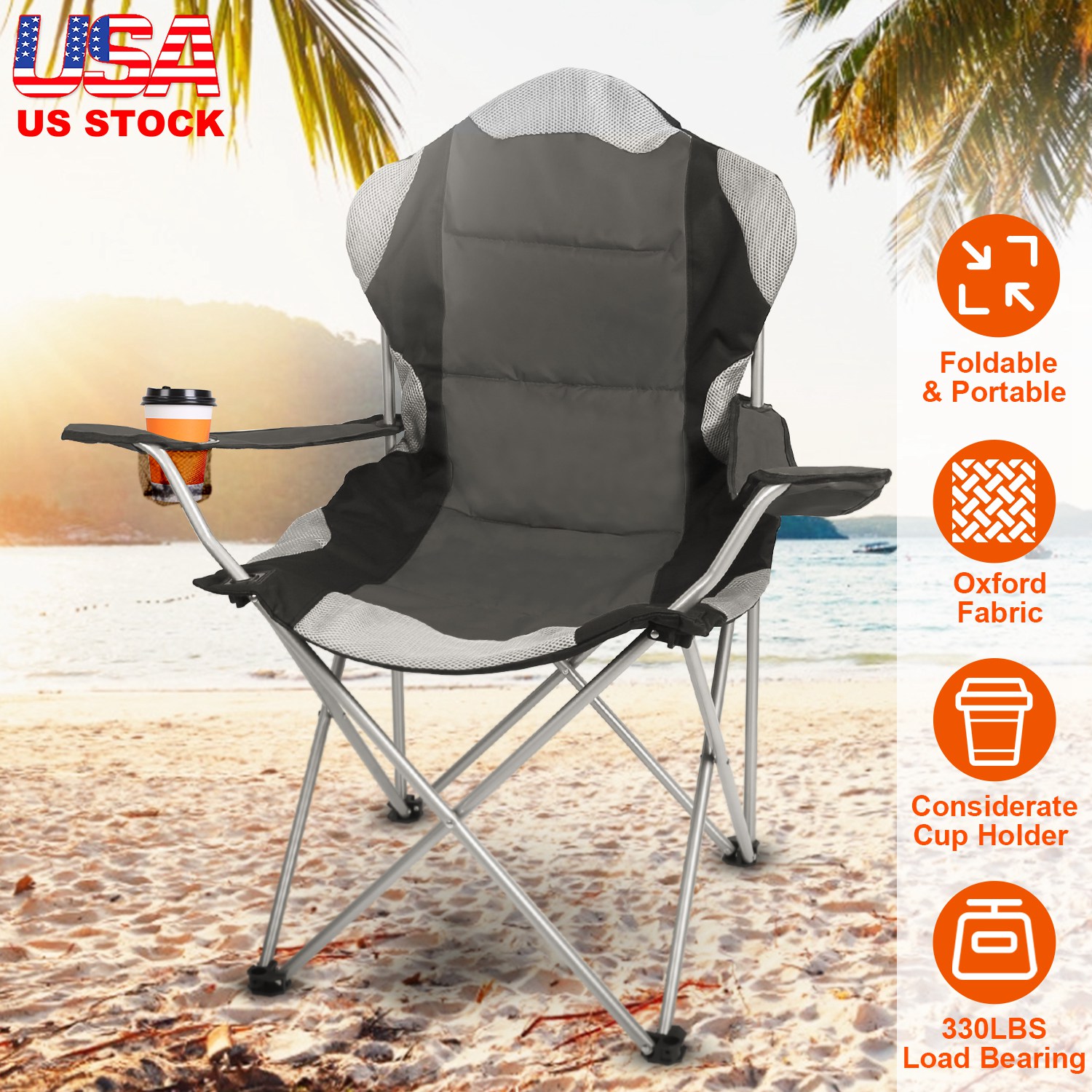 Home > Foldable Camping Chair Heavy Duty Steel Lawn Chair Padded Seat Arm Back Beach Chair 330LBS Max Load with Cup Holder Carry Bag