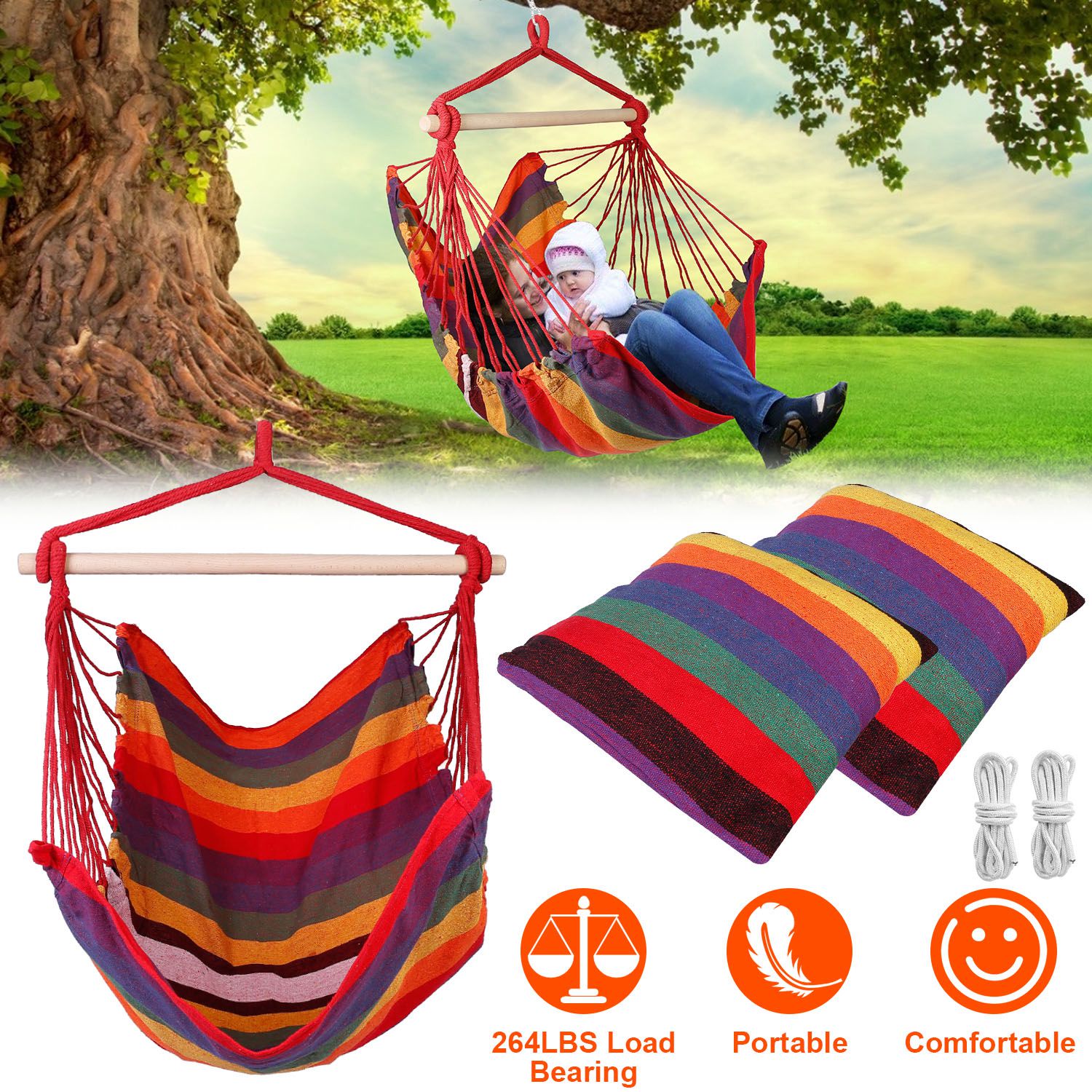 Home > Hammock Hanging Chair Canvas Porch Patio Swing Seat Portable Camping Rope Seat Wooden Stick Hammock Chair with 2 Pillows 265LBS Load-bearing