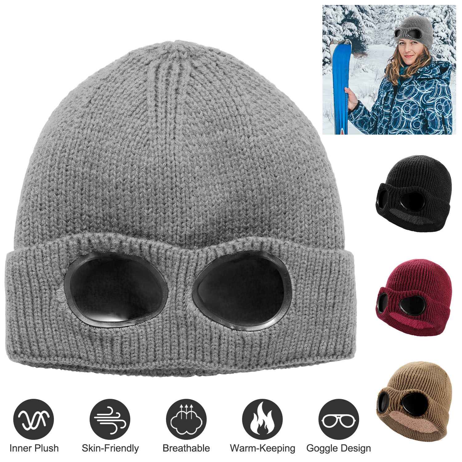 Unisex Knit Beanie Hat with Goggle Chunky Winter Warm Hat Skull Cap 4 Colors