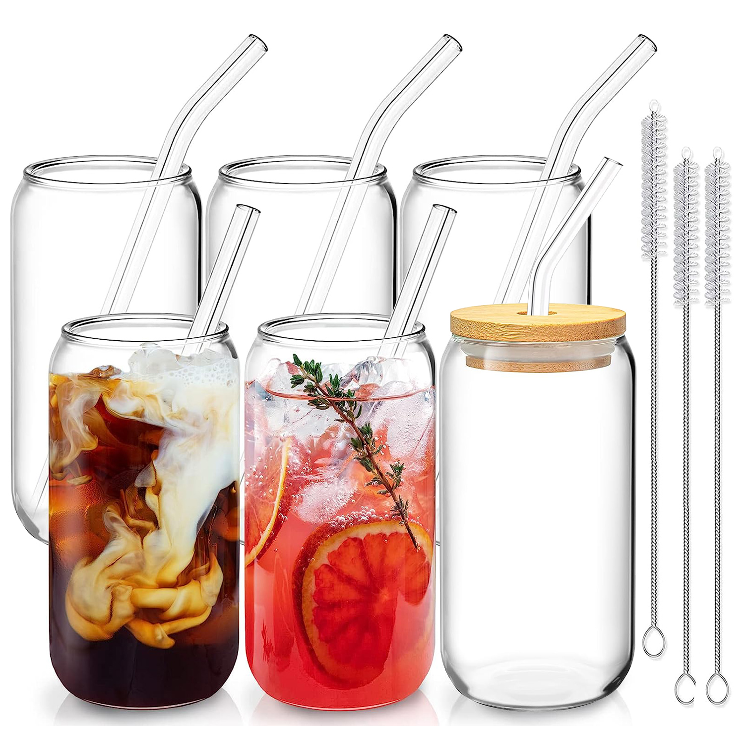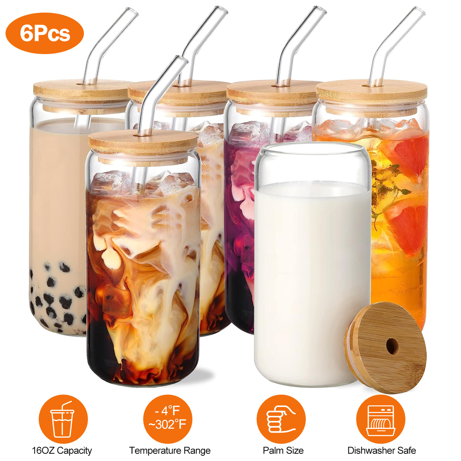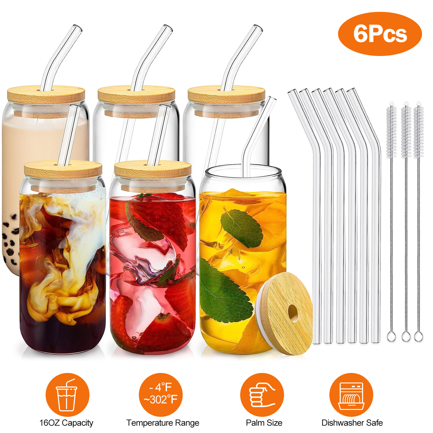 Home > 16Pcs Mason Jar Cups with Lid 16OZ Reusable Glass Beer Can with Bamboo Lids Glass Straws Cleaning Brush for Iced Coffee Smoothie Tea