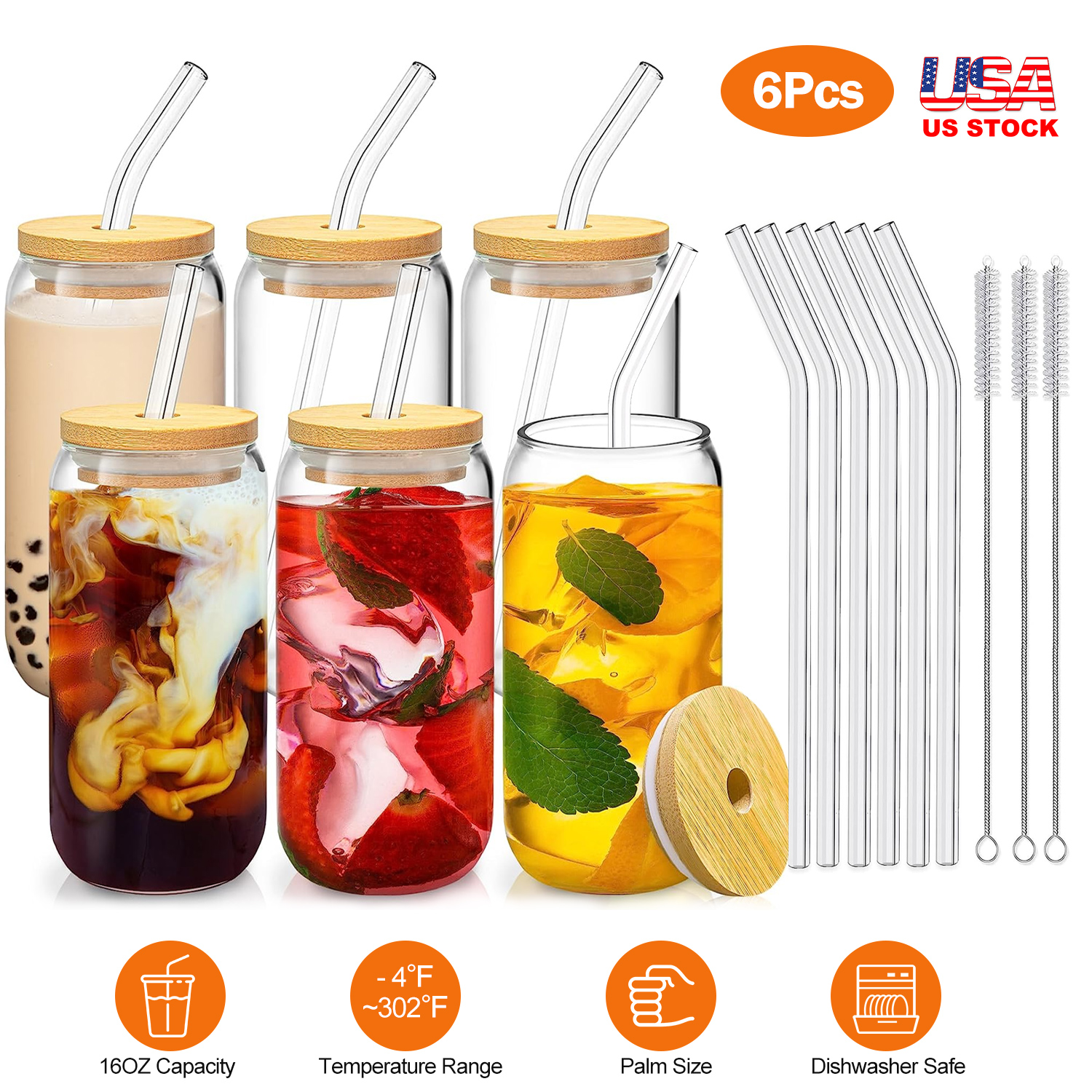 16Pcs Mason Jar Cups with Lid 16OZ Reusable Glass Beer Can with Bamboo Lids Glass Straws Cleaning Brush for Iced Coffee Smoothie Tea